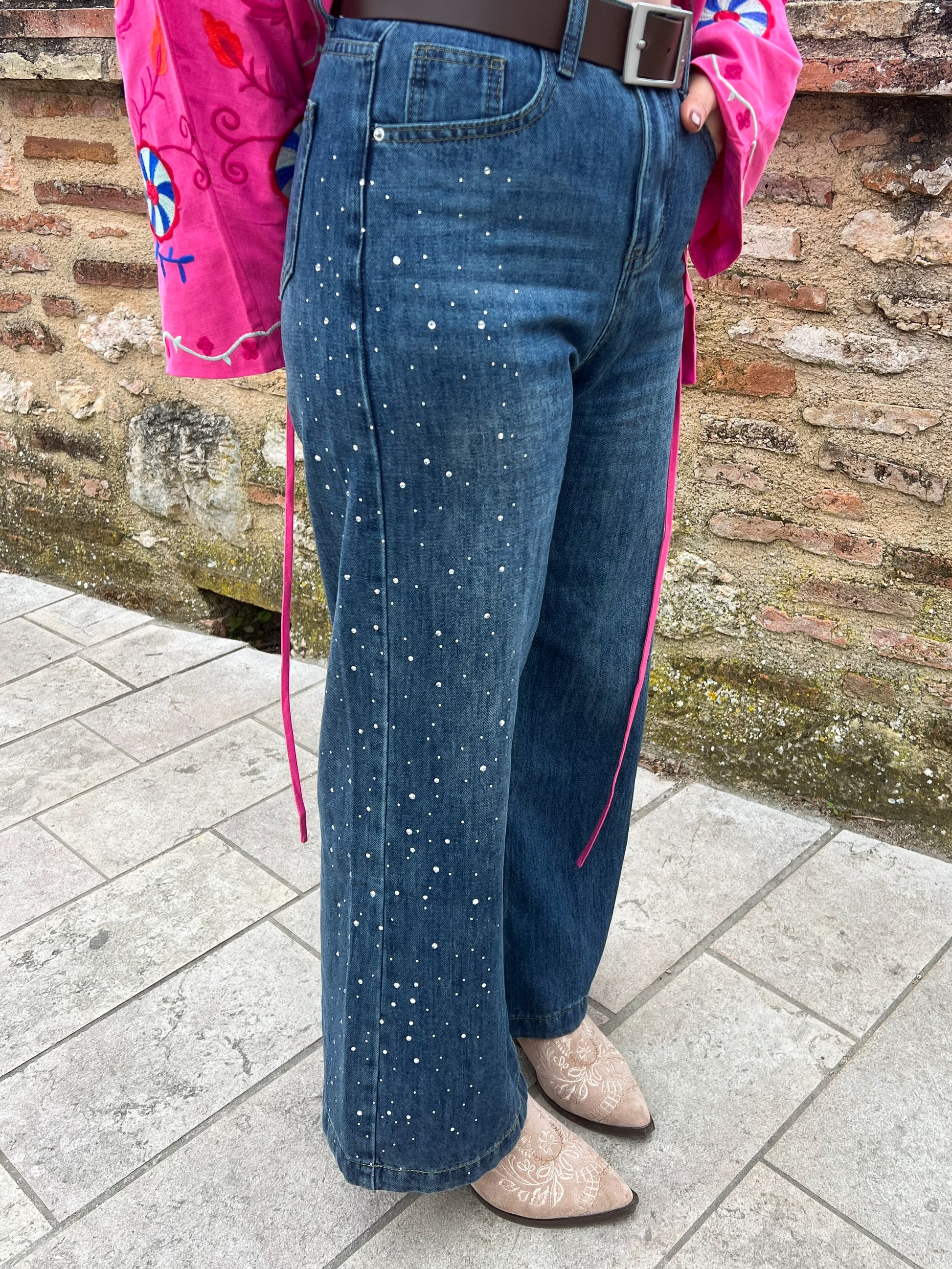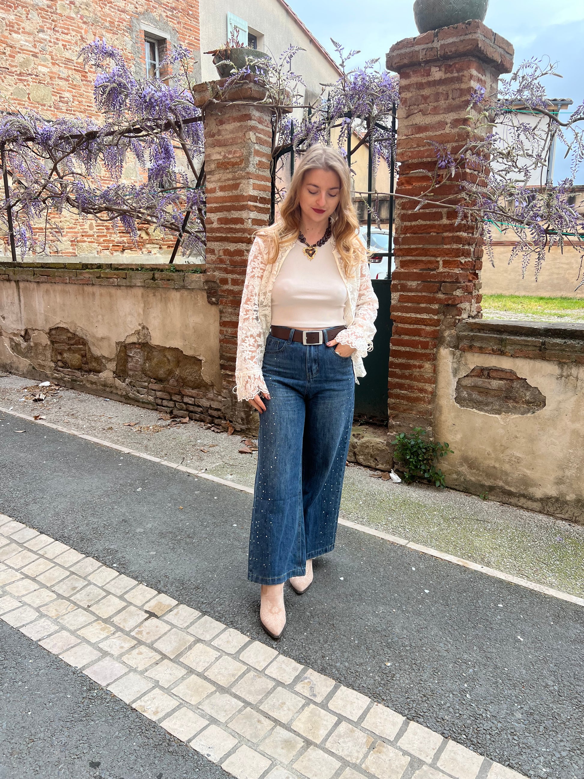 Ses détails en strass ajoutent une note lumineuse et originale, idéale pour changer un look du quotidien. Doté de passants pour ceinture, de deux poches à l'avant et de poches plaquées à l'arrière, il allie praticité et style.