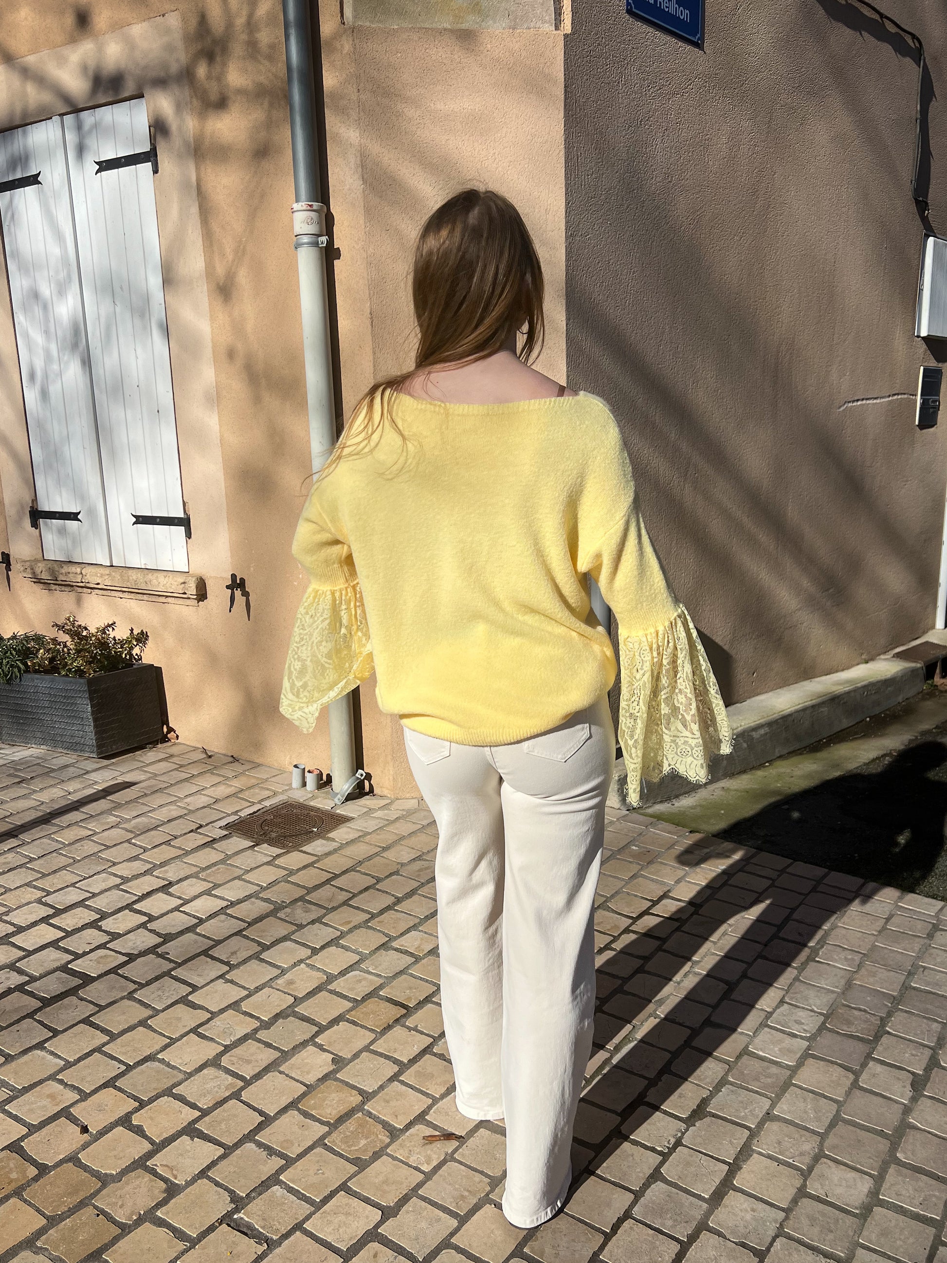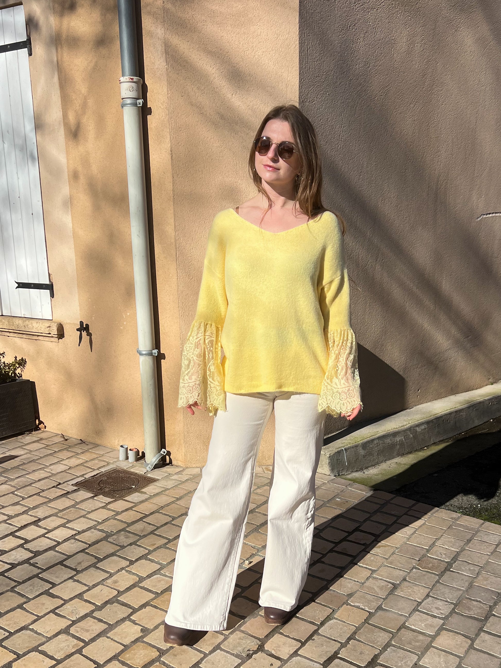 La dentelle subtilement travaillée sur le bas des manches apporte une touche féminine et élégante, tandis que sa coupe agréable à porter enveloppe la silhouette avec douceur. Son col V met en valeur le décolleté avec discrétion, idéal pour une allure à la fois sophistiquée et naturelle.