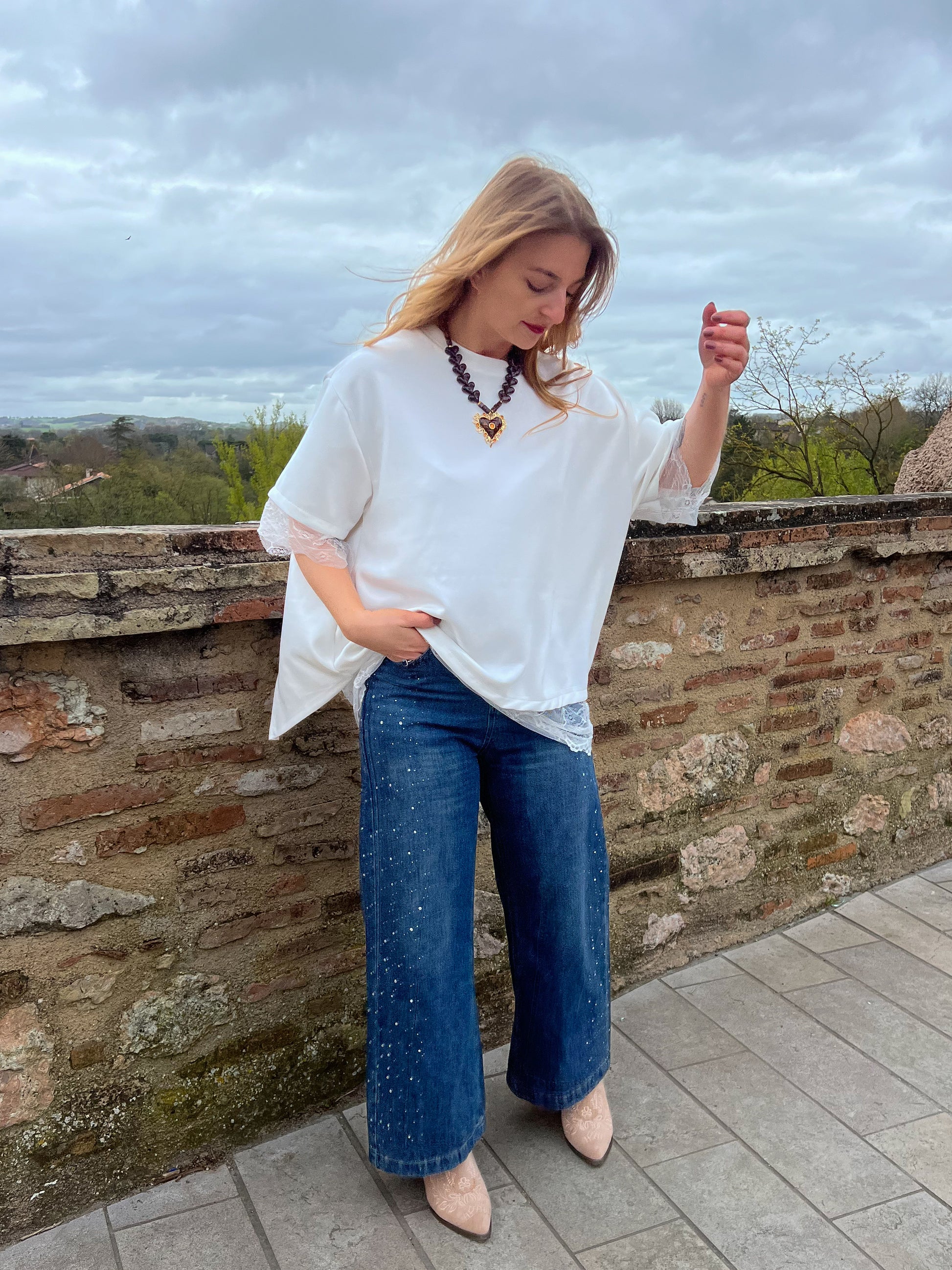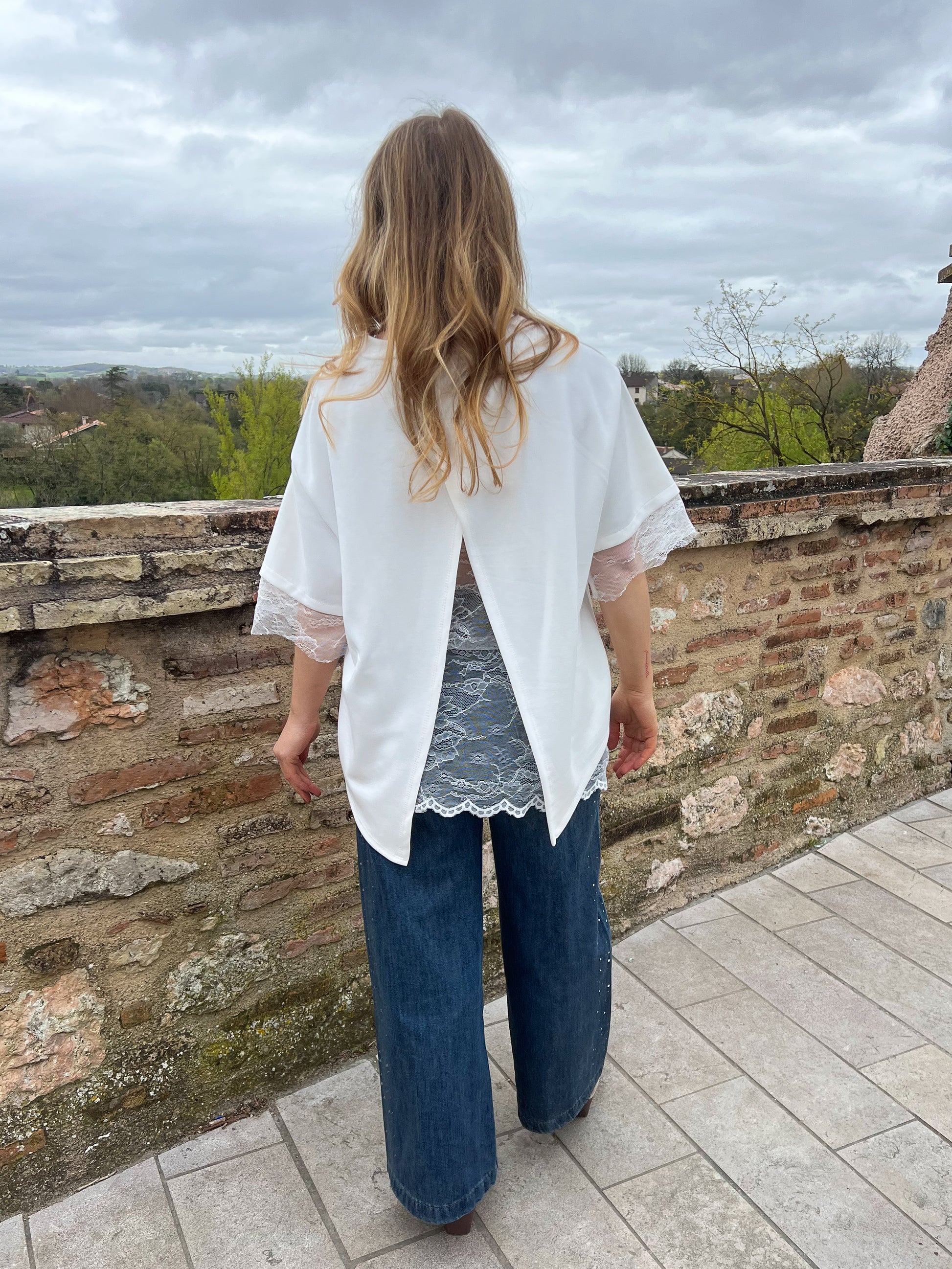 Polyvalent, il s’associe aussi bien avec un jean pour un look casual qu’avec une jupe ou un pantalon plus habillé pour une tenue plus sophistiquée. Les détails en dentelle viennent rehausser l’ensemble et apportent ce petit plus qui fait la différence.