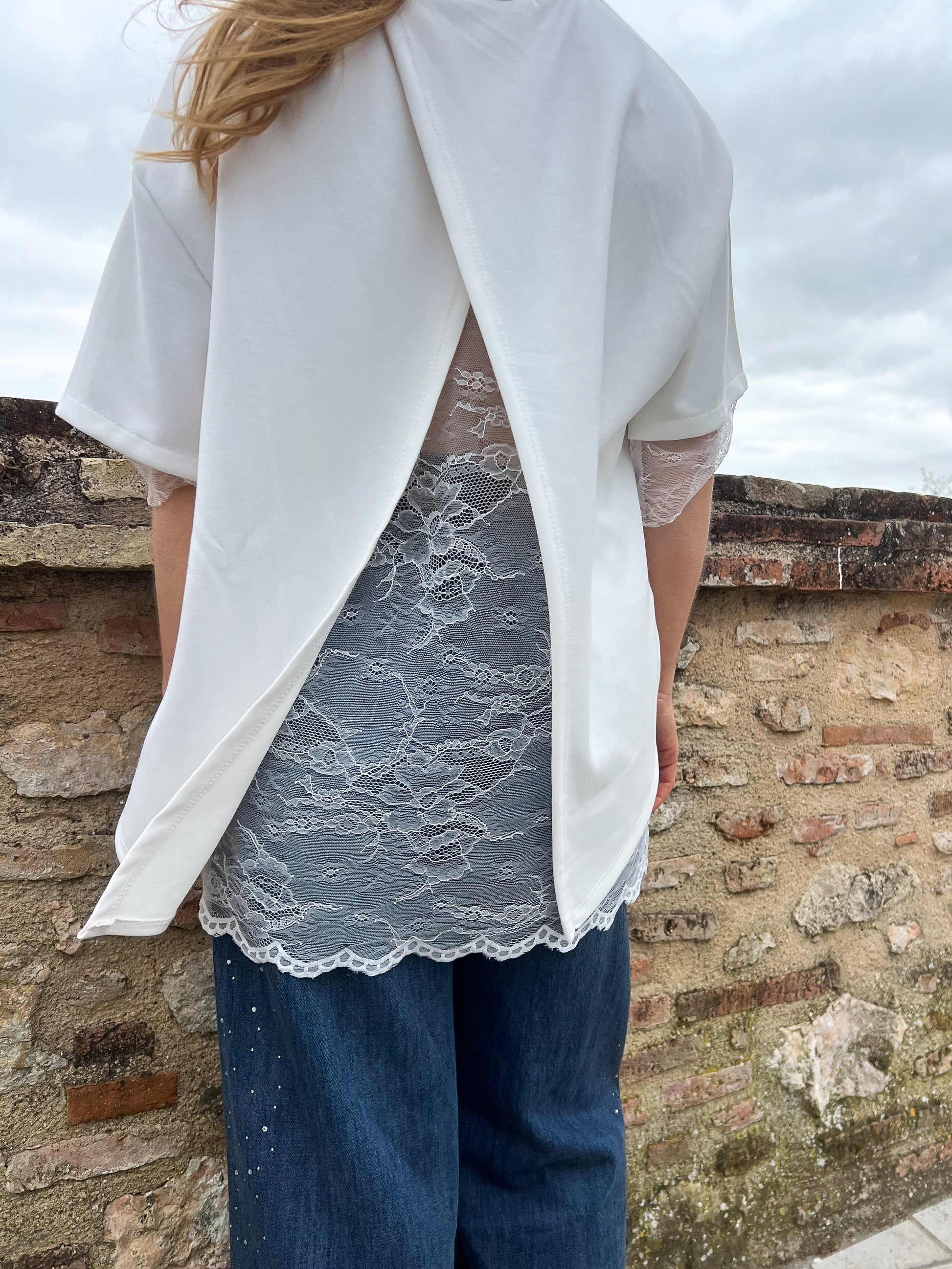 Féminin et facile à porter, ce t-shirt revisite un basique du dressing avec une touche de délicatesse. Ses empiècements en dentelle au dos et sur le bas apportent une note élégante et raffinée, tout en jouant subtilement avec la transparence. Son col rond et ses manches courtes en font une pièce confortable et intemporelle, idéale au quotidien.